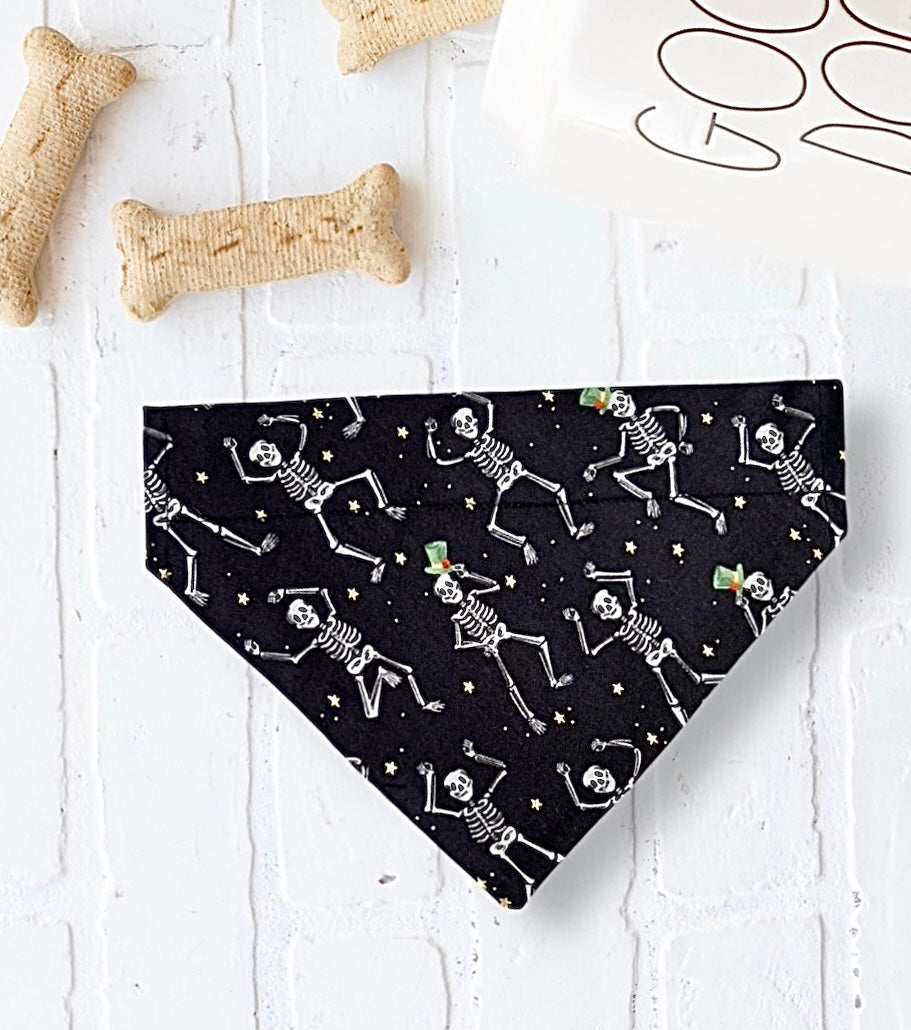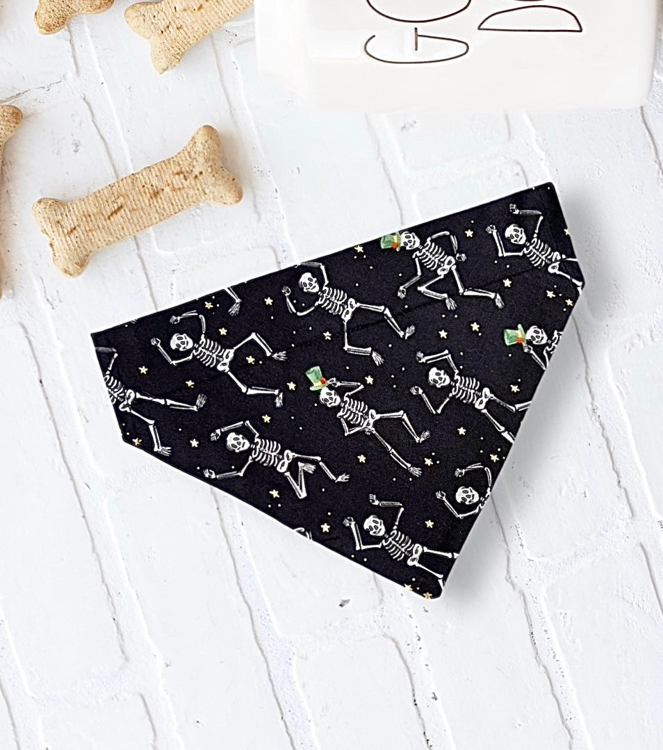 Halloween dog bandana or cat bandana - black dancing skeletons: Cat or dog bandanas for Halloween are the perfect pet accessories. Each Halloween bandana dog scarf is handmade and slides easily over a cat or dog collar. Excellent fall dog bandana!