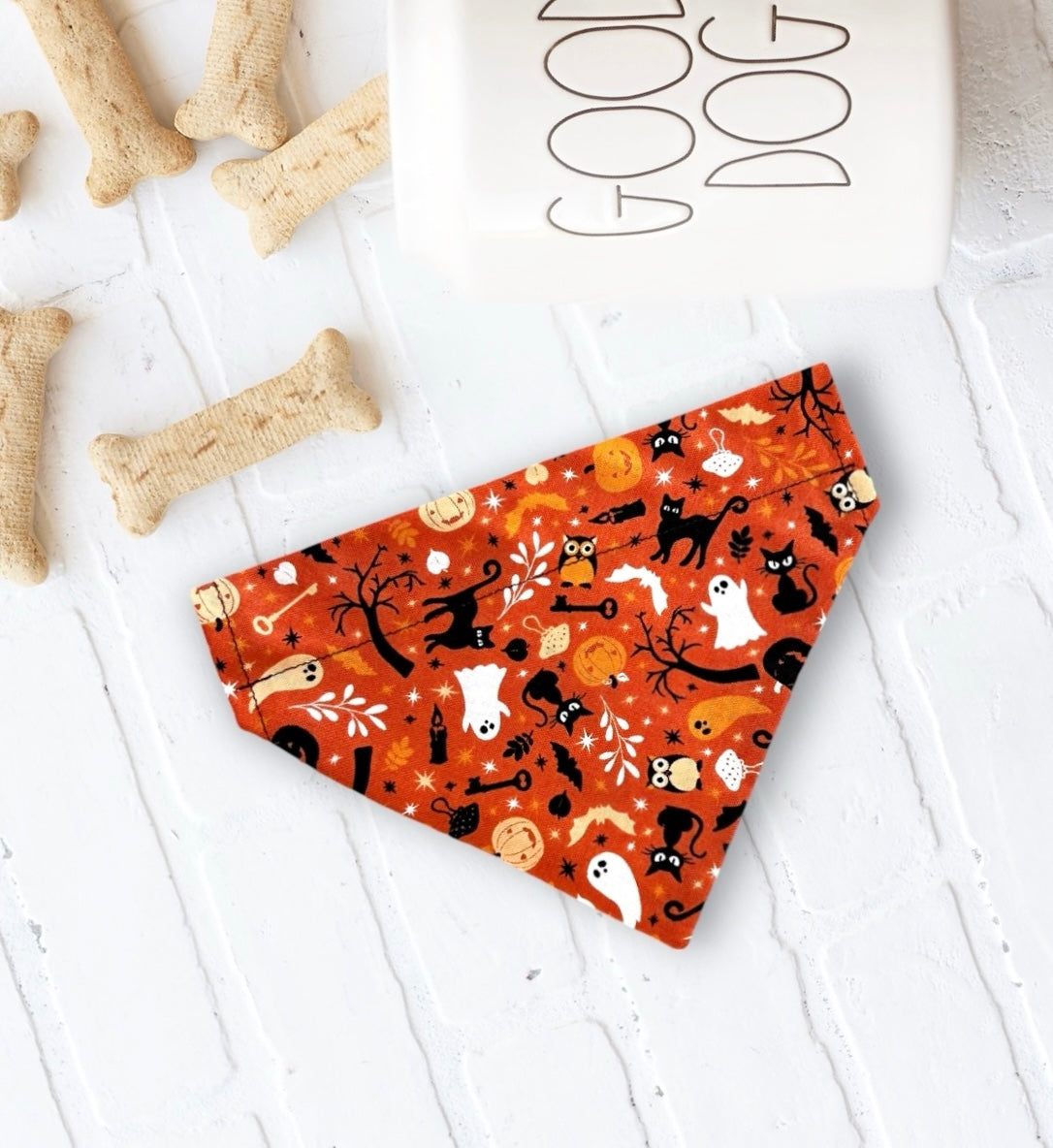 Halloween dog bandana or cat bandana - Orange Happy Halloween: Cat or dog bandanas for Halloween are the perfect pet accessories. Each Halloween bandana dog scarf is handmade and slides easily over a cat or dog collar. Excellent fall dog bandana!