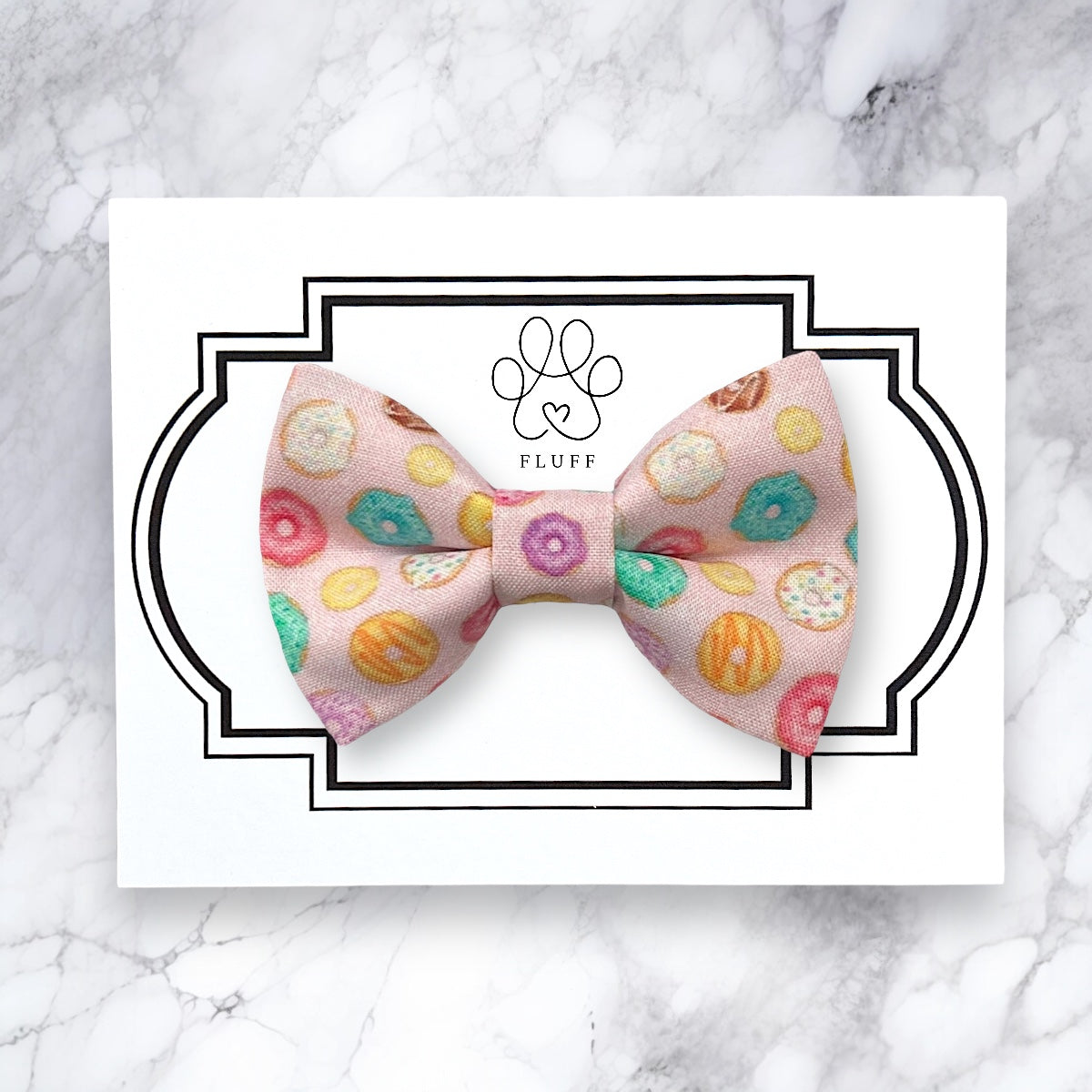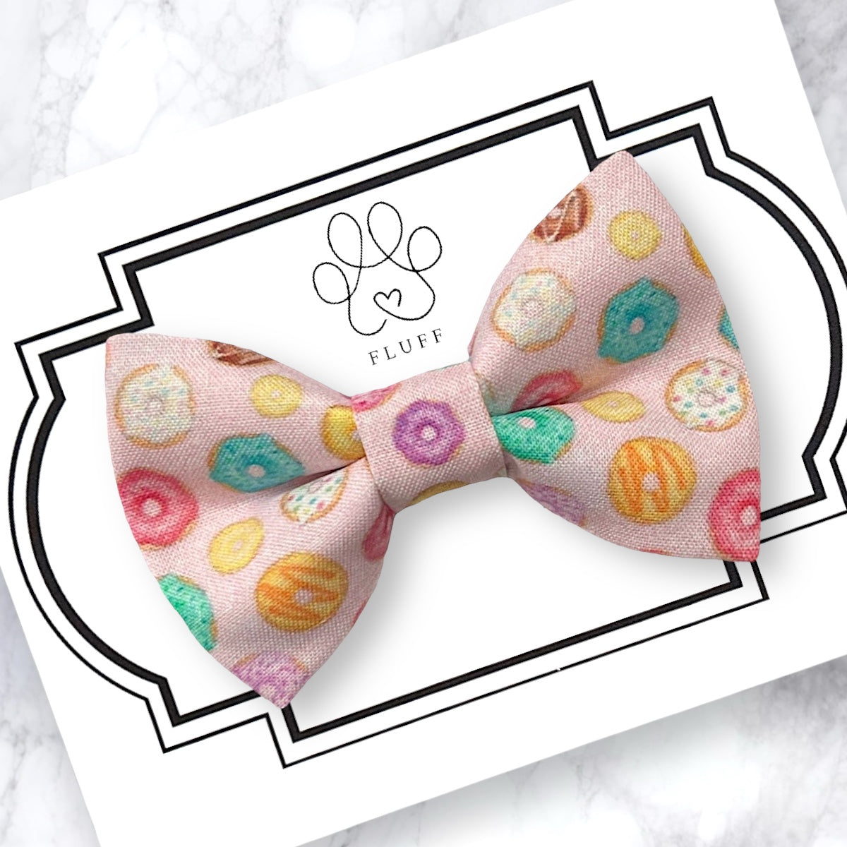 Donut dog bow tie or cat bow tie easily slips on a dog collar or cat collar with elastic! This bowtie features colorful donuts, perfect for National Donut Day. It is perfect for a dog gift, bow tie for dogs, dog accessories, dog lover gift, cat gift, or any other special occasion!