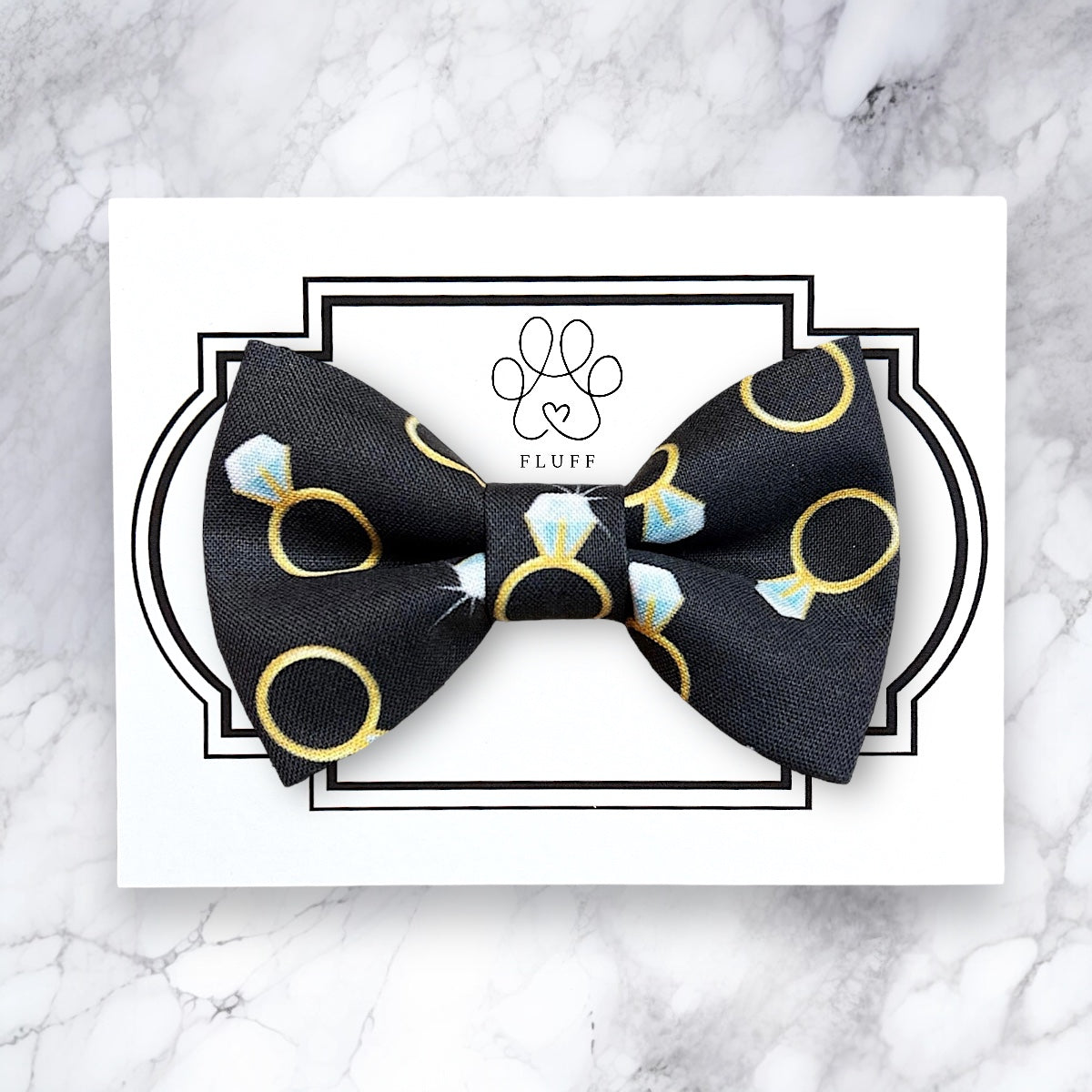 Engagement Ring on Black bow tie or cat bow tie slips easily onto a dog collar or cat collar with elastic to help them look their best! It is the perfect dog lover gift, dog bowtie, spring bow tie for dogs, or a lady bow for girl dogs or girl cats. This bow tie is perfect for a dog ring bearer, a dog bridal brunch or engagement photos with your dog!