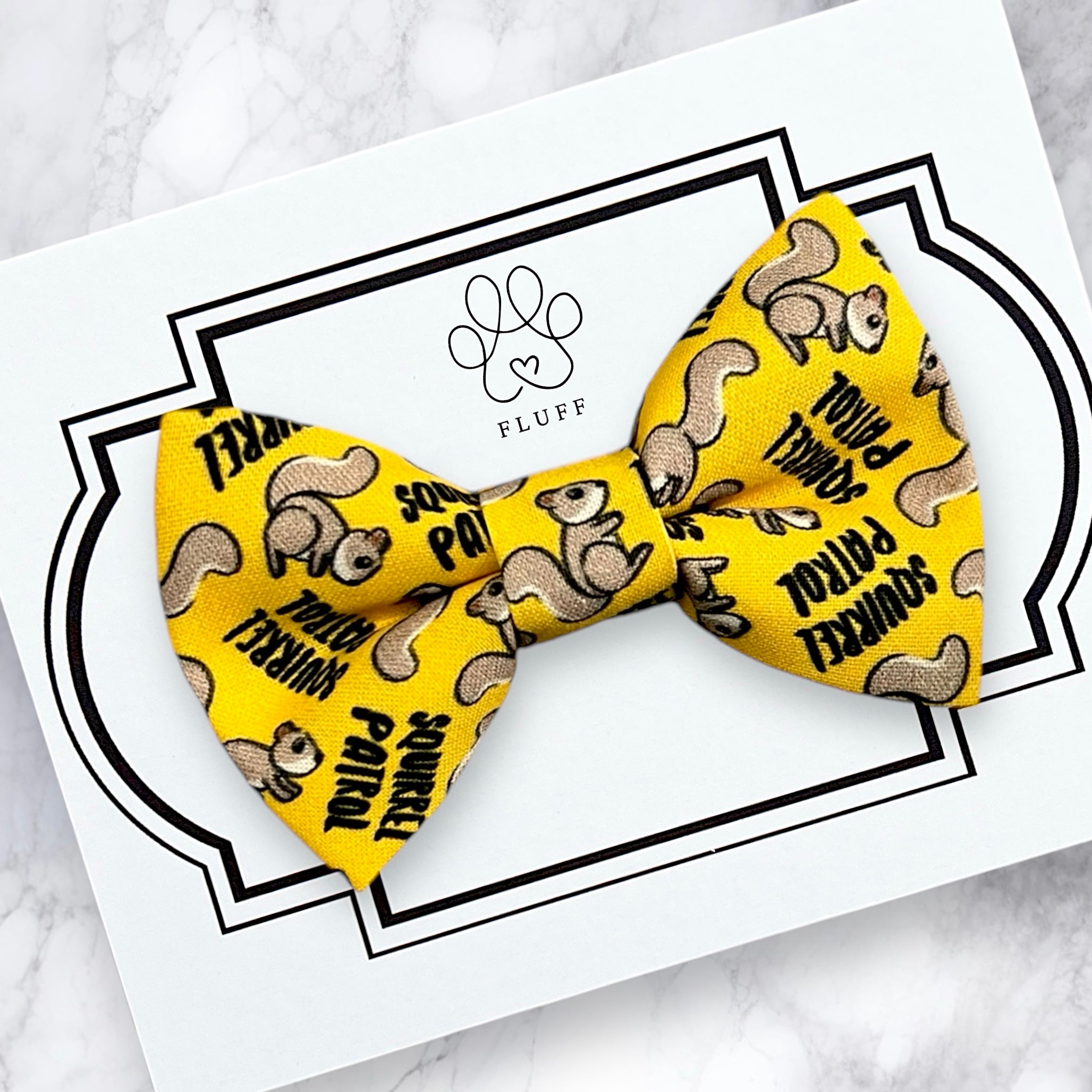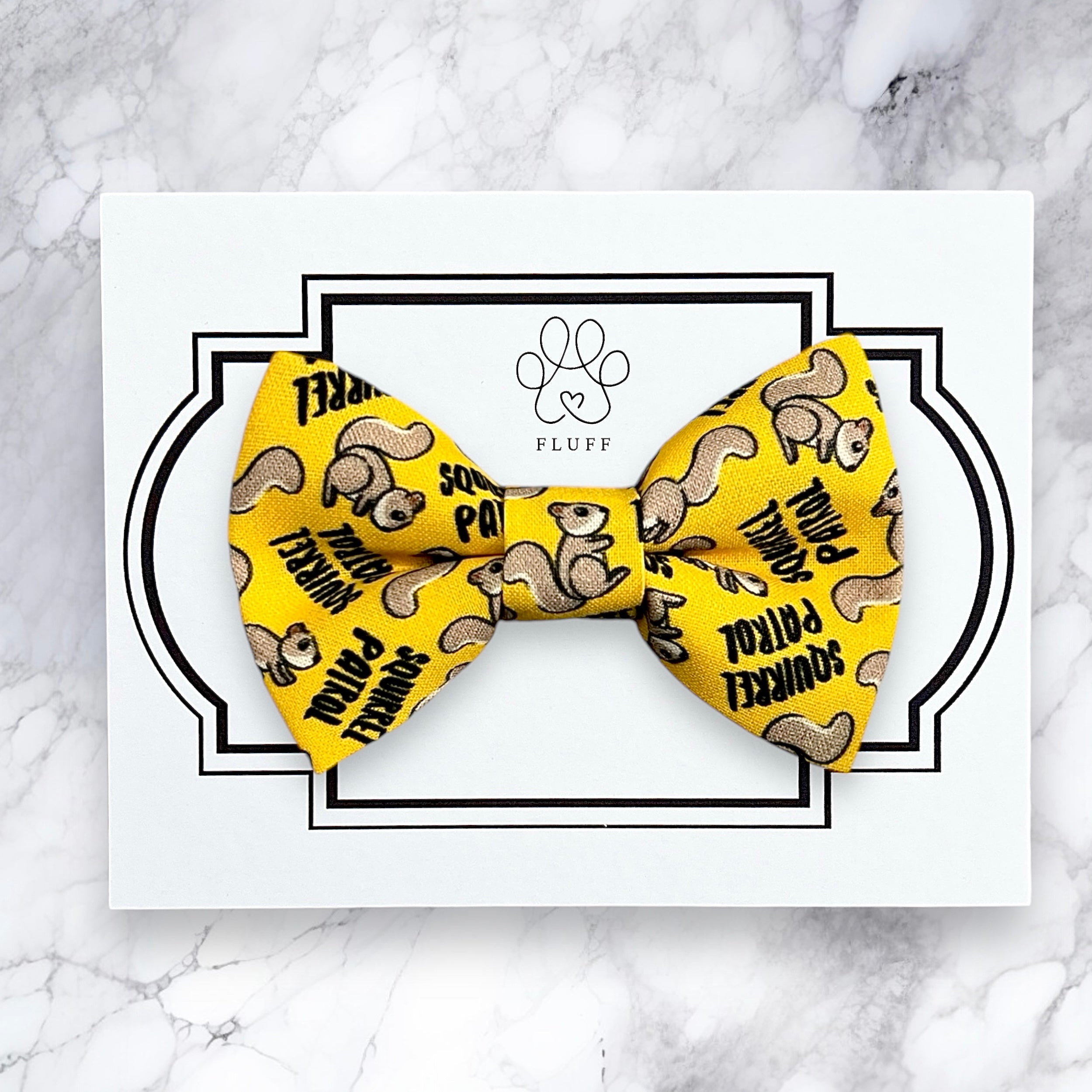 Our squirrel patrol dog bow tie or cat bow tie for dog collar or cat collar attaches easily with elastic. It makes the PERFECT dog owner gift, dog bowtie, dog mom gift, dog gifts or for any other special occasion!