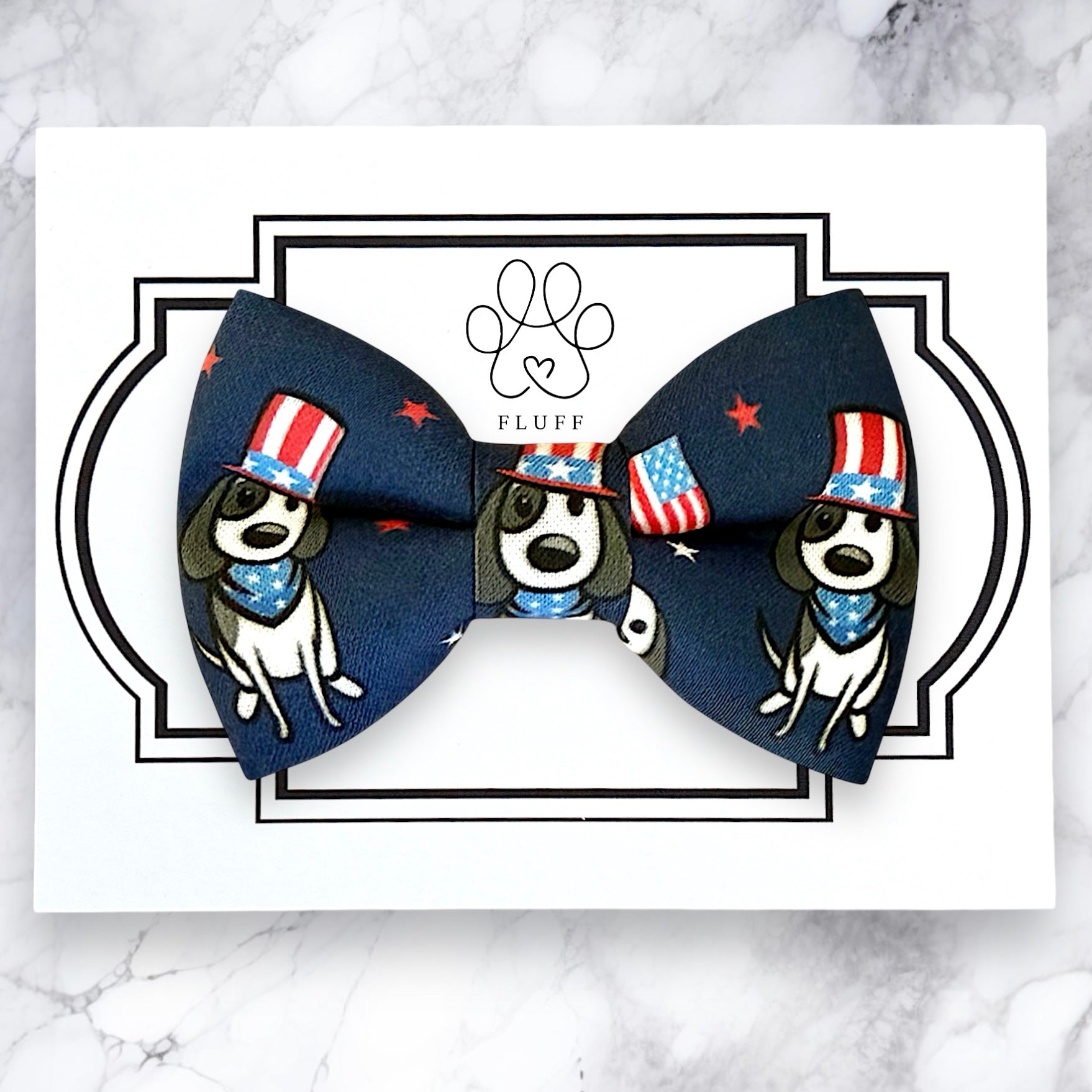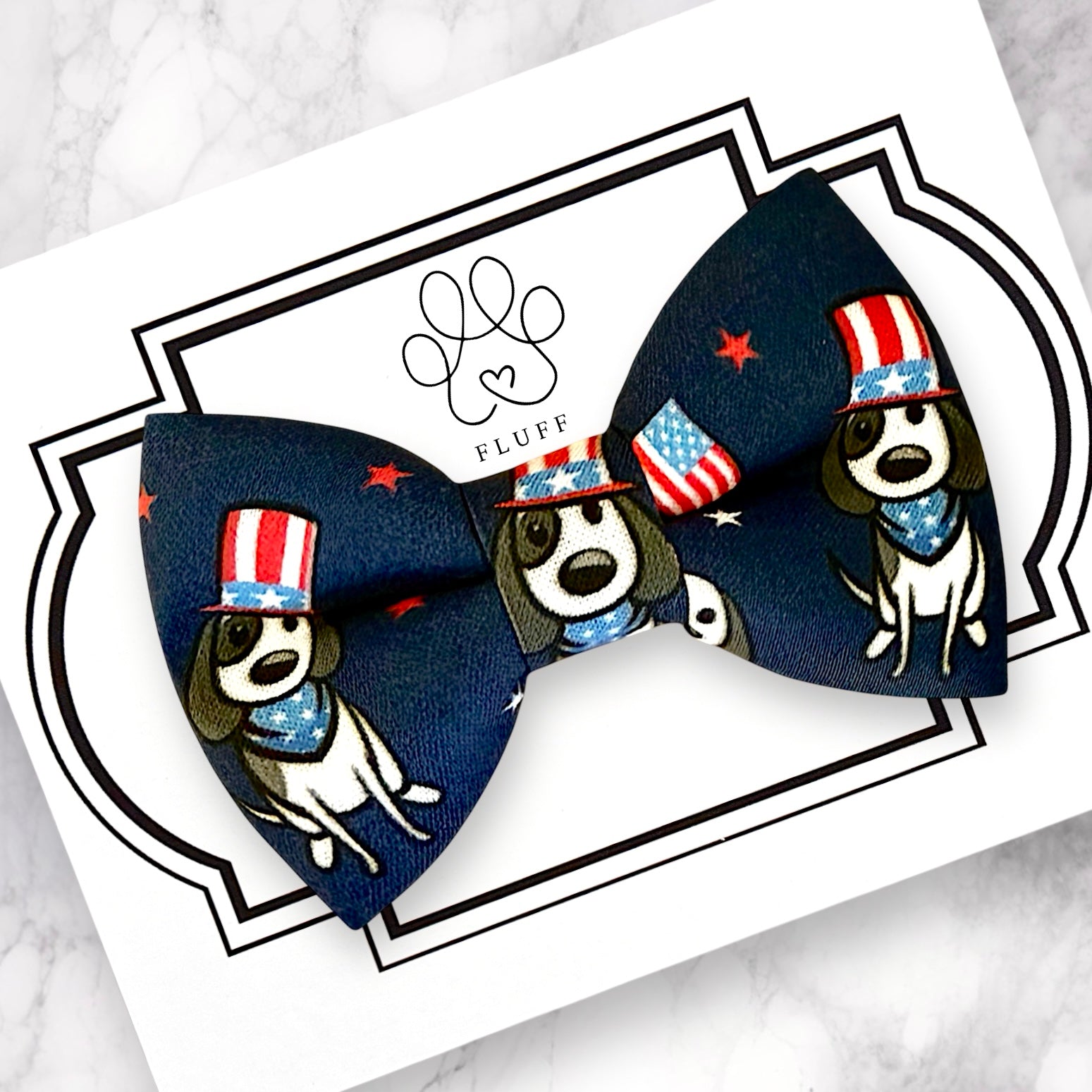 Patriotic Pups Dog Bow Tie in Navy: Celebrate the 4th of July with a festive dog bow tie! Perfect for the Fourth of July, this cute puppy bow tie will be a great addition to your dog bowties and dog ties!