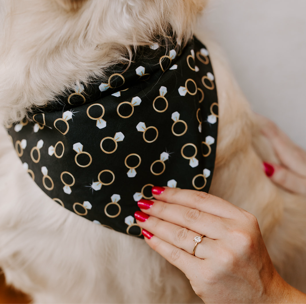 Engagement dog bandana or cat bandana - black and white engagement ring: Cat or dog bandanas for Valentine's Day, or to celebrate a special engagement, are the perfect pet accessories. Each Valentine dog bandana dog scarf is handmade and slides easily over a cat or dog collar. Excellent Valentine bandana for your furry friend!